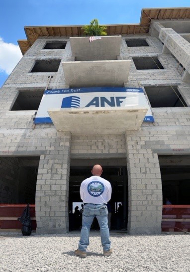 The May 10 gathering was a ‘topping off’ ceremony. The construction industry tradition includes flying an American flag and putting a tree on a top floor. “It’s a celebration for pouring the concrete [slabs] for all five buildings,” said Project General Superintendent Dan Cositore, who is with general contractor ANF Group, Inc. “It’s to say thank you for the hard work, non-stop, through the rain.”